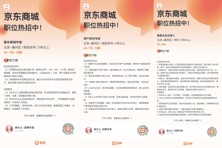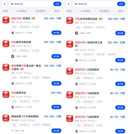 在新车信息密集曝光的同时,记者注意到,京东汽车近期在人才招募上也有大动作。多个招聘平台信息显示,京东汽车已释放多个高薪岗位,部分岗位年薪突破百万元:汽车零售事业部算法工程师岗位年薪最高可达123万元(35k-65k·19薪),汽车后市场商品总监岗位年薪最高可达114万(30k-60k·19薪),汽车行业采销负责人年薪最高可达112万(45k-70k·16薪),整车营销专家与用户研究专家年薪最高可达133万(40k-70k·19薪),商家生态负责人年薪最高也可突破百万(60k-90k)。知情人士分析,此举或为“国民好车”上市及后续用户运营、供应链管理储备核心力量。